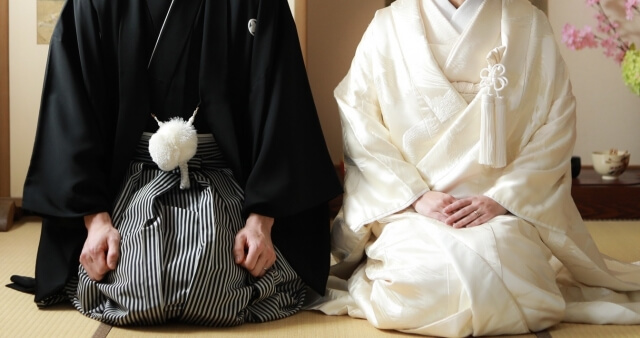 新郎の紋付袴はシンプルながらも、シワをなくし、凛々しく見せる着付けスキルが必要です。裾の長さや羽織のバランスにも注意を払います。新婦だけが主役ではなく、和装は男性を引き立たせる力があるので、きちんと紋付袴を着こなせていることで印象が大きく変わります。