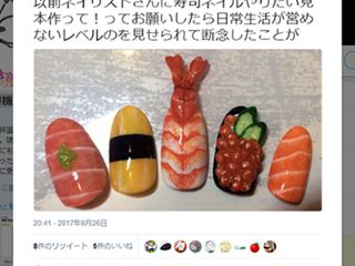 ネイルには様々なデザインがあり、変わったモチーフに挑戦する女性も少なくありません。中には「ネイルでそんなデザインが出来ちゃうの!?」と驚かされるものも。最近ではネイル好きな女性の間で「寿司ネイル」なるものが流行っているようで、Twitter上には、自作やネイルサロンで作ってもらった「寿司ネイル」の画像がちらほら。