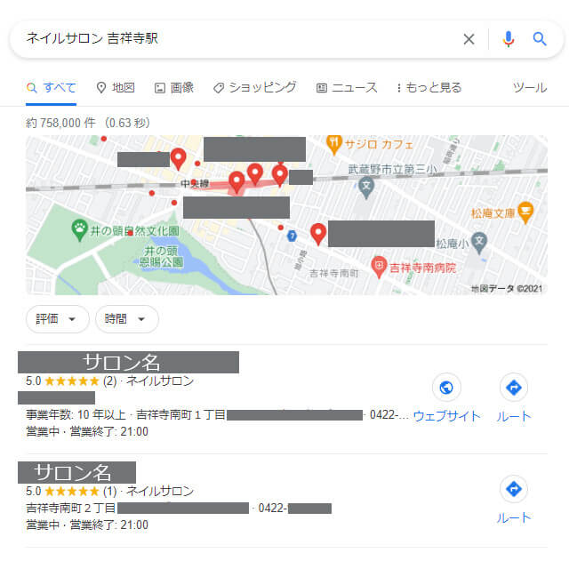 そんな時に役立つのが、Google検索ではないでしょうか。今いるエリアで、近くにあるネイルサロンを見つける事ができるのです。例えば、「ネイルサロン 吉祥寺駅」と検索する事で吉祥寺駅付近にあるネイルサロンが自動的に表示されます。そこへ表示させるにはサロン側で「Googleビジネスプロフィール(旧:Googleマイビジネス)」へ登録しておく必要があるのです。このサービスは無料で活用する事ができるので、登録しておいた方が良いでしょう!