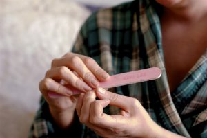エメリーボードで爪の長さを調整して、爪の形を整えていきます。爪を切って形を整えるより、エメリーボードを使って削る方が綺麗なラインの爪に仕上がります。
