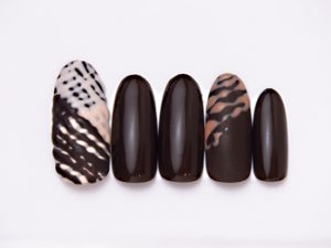 繊細な模様をモチーフにしており、チョコネイルのひとつとして人気があります。チョコネイルは、バレンタインや冬にぴったり♪マットなホワイト系カラーとチョコレートカラーがあれば描けるので、セルフでも十分にできますよ。