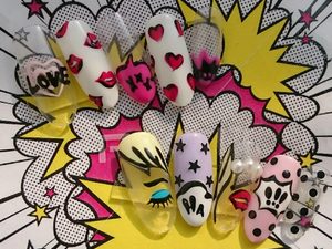 簡単にアメコミ感のあるネイルに仕上げられるのが、ブルー・レッド・イエローの組み合わせ。細かな作業が苦手な人でもこの色の組み合わせさえ覚えておけば、アメコミ感たっぷりのネイルに仕上がりますよ。イエローをベースカラーにブルーの吹き出し、レッドの英字だと色のコントラストがはっきりします。