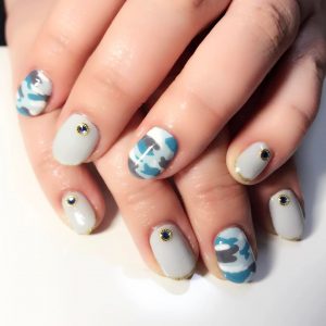 淡いグリーン系やグレー系は肌馴染みが良く、カラーの相性も抜群です。取り入れるのが難しいグリーン系も、くすみカラーを使えば遊び心のあるクールなデザインに早変わり。2色を組み合わせてカモフラ柄を描けば、大人の色気が漂うカッコ可愛い仕上がりになります。