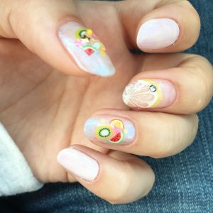 爪ごとに好きなフルーツを連想させるクリアカラーマニキュアを塗ります。仕上げにその色に合ったフルーツのパーツをトッピングすれば、カラフルなゼリーネイルの出来上がりです。