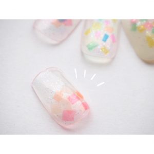 乳白色をベースにホログラムを散りばめます。ホログラムの形はハート型がおすすめ。色合いがまるでナタデココのような乙女チックなゼリーネイルに仕上がります。
