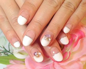 パーティーやフェスなどで誰とも被りたくないネイルにしたいなら、ジュエリーネイルとフレンチネイルの組み合わせがおすすめです。薬指だけをワンカラーベースにしてジュエリーパーツを付けます。残りの指はフレンチネイルにすることで、全体的なまとまり感が出て、かわいらしさがアップしますよ。