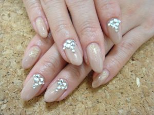 肌馴染みの良いヌーディカラーを単色塗りにして、キラキラ輝くジュエリーパーツを根元・中央・爪先などお好みの位置に施します。ジュエリーパーツにブリオンを合わせることで、本物の宝石のようなキラキラした仕上がりになること間違いなしです。
