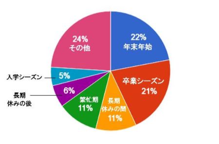 また、同じぐらい多かった回答で意外にも「卒業シーズン」に転職を考えるといった人もいました。3月は別れのシーズンでもあり、何故だか今いる環境に区切りをつけたくなってしまう時期なのかもしれません。これは、学生時代のなごりがあり4月には学年が変わり、新学期が始まる事が関係しているのかもしれませんね。