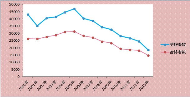 2005年をピークに、年々減少傾向にあります。ピーク時に比べると、2013年の合格者数は約4割減。
