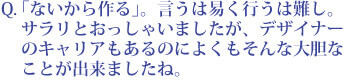 いいと思ったらすぐに行動すること。それが鉄則。デザイナー時代にもいくつかの会社を渡り歩きましたが、 どの場面でもそれを実践していました。だから、困難といわれる転職も次々と実現できたのだと思います。 もちろん、いいと思う以上、それだけの思いがなければ、そこへはたどり着けない。あるアパレルメーカーの中途試験では、 ブランドのイメージをボードで3パターン作ってプレゼン。そこまでする人はさすがにいなくて、「デザイナーは採らない」といわれていたところもパスしました。
