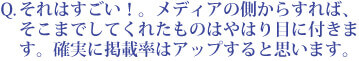 まず、もうヘア業界にアピールしてもダメと悟りました。 そして、ビューティー界へモーションをかけたんです。実際、カリスマの時代も終わりつつあるのを感じていましたし、 雑誌などでもヘアについて扱う量が減ってきていましたから。 それでとにかく存在を知ってもらうために雑誌社に手作りのリリースを持ち込むなどして必死でアピールしました。 もちろん雑誌社には多くのリリースが来るでしょうからなんとか扱ってもらえるよういろいろと工夫しました。 常に業界最先端のものをいち早く導入し、AMATA流にメニューに組み立て、オンリーワンのメソッドとしてPR。 実際にプレスの方たちに体験してもらうなど、とにかくアピールしつづけました。 よりよく理解してもらえるよう「プロセスリリース」というものを作り、読者が喜ぶことも視野に入れ全体の構成にも細かく配慮しました。