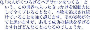 今のお客様は、本当に知識が豊富で半端なサービスではウソが見抜かれてしまいます。 例えば、取り扱っている商品ひとつをとっても成分をしっかりと把握しておかなければ、信用は得られません。 信用がないサービスに安心はないですし、本当の心地よさは得られませんよね。 ですから、ウチではスタッフ全員が扱っている商品の成分を熟知しています。 私も含めて3人が毛髪診断士の資格も取得しています。接客にしてもそうです。 ただ、闇雲に元気な声で「ありがとうございました」では、不快な場合もある。 雑誌や飲み物をお出しするにしても、タイミングや好みなどがある。空気感が読めて、 引き加減を知ることが大切だと思います。