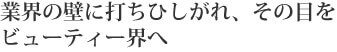 環境としては、ビューティーの世界に携わっている人間がまわりにたくさんいたので、 踏み出すのにそれほどの躊躇はなかったんです。ただ、美容業界の壁は想像以上に高かったですね。 何より完全なタテ社会であり、男性が動かしている世界。新参者で女性の私が入っても相手にされませんでした。 ヘアエステという新しい試みは「切れないからでしょ?」であり、無名の私には「どこの畑なの?」という感じ。さすがに疎外感を感じ、へこみましたね。