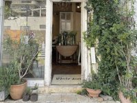 白い扉が目印の、木の温もりと緑に囲まれた店内。