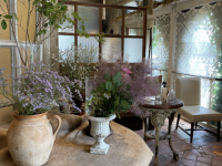 白い扉が目印の、木の温もりと緑に囲まれた店内。