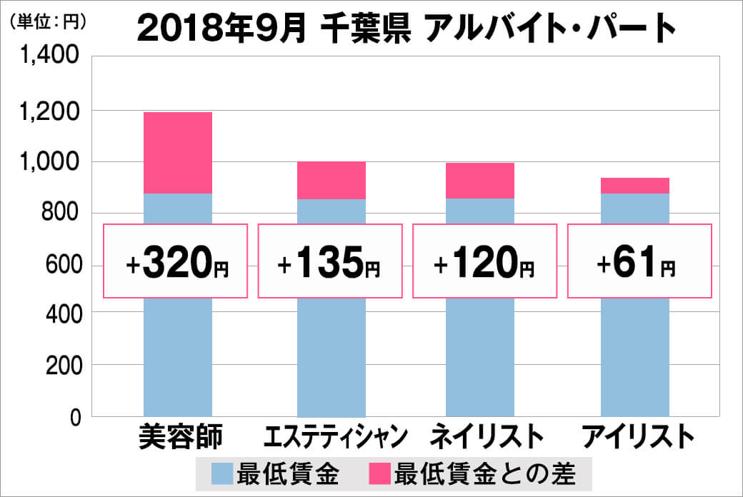 2018年9月時点で『美プロ』に掲載されている「千葉県」の「美容師・エステティシャン・ネイリスト・アイリスト」求人原稿における「正社員」「アルバイト・パート」の給料を抽出。