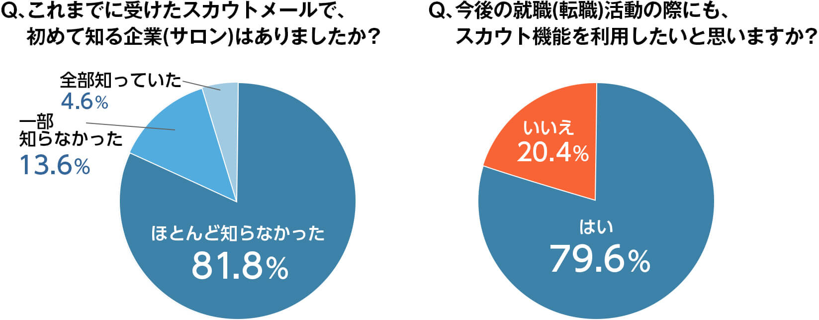 これまでに求人サイトのスカウト機能を利用したことのある方を対象に、「これまでに受けたスカウトメールで初めて知る企業(サロン)はありましたか?」「今後の就職(転職)活動の際にも、スカウト機能を利用したいと思いますか?」という内容のアンケートを美プロ内に設置し、その回答を集計。