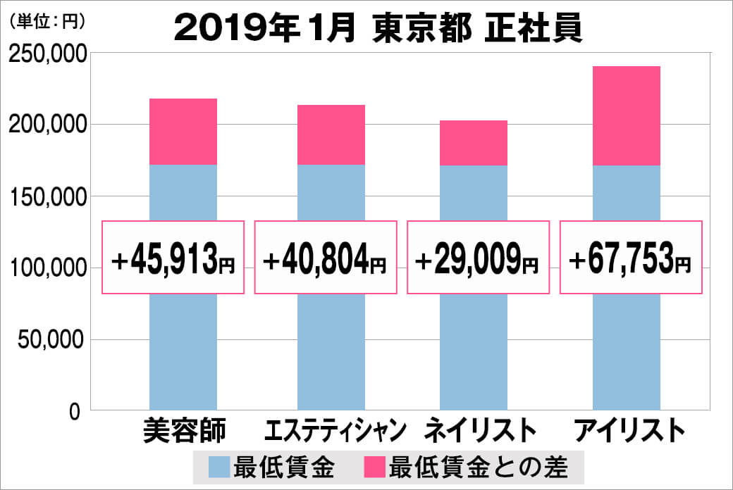 2019年01月時点で『美プロ』に掲載されている「東京都」の「美容師・エステティシャン・ネイリスト・アイリスト」求人原稿における「正社員」「アルバイト・パート」の給料を抽出。