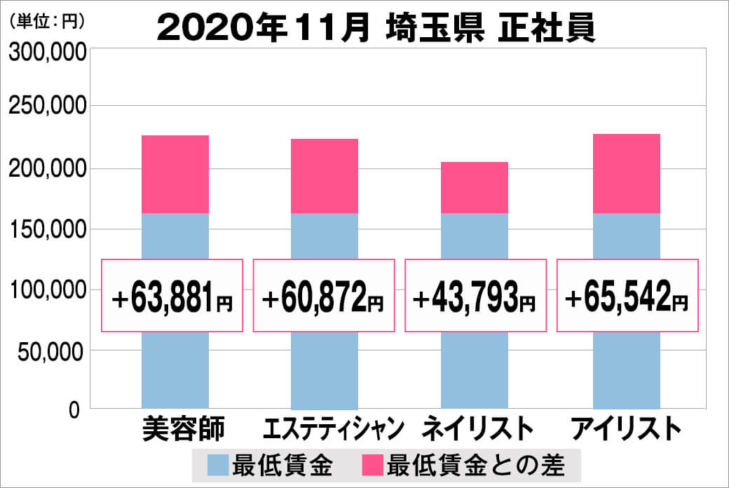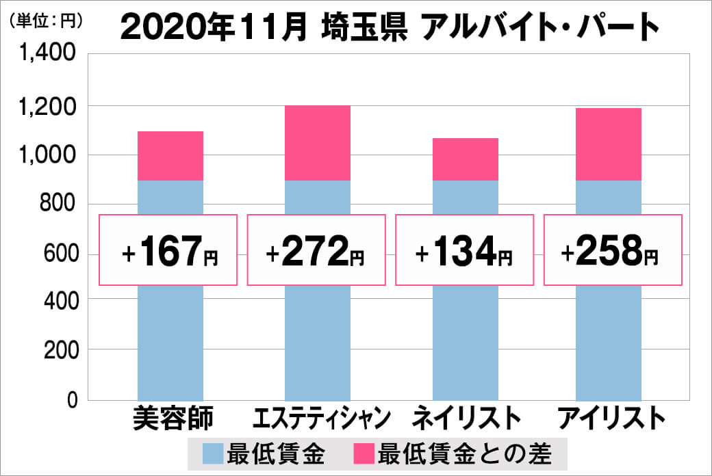 2020年11月時点で『美プロ』に掲載されている「埼玉県」の「美容師・エステティシャン・ネイリスト・アイリスト」求人原稿における「正社員」「アルバイト・パート」の給料を抽出。