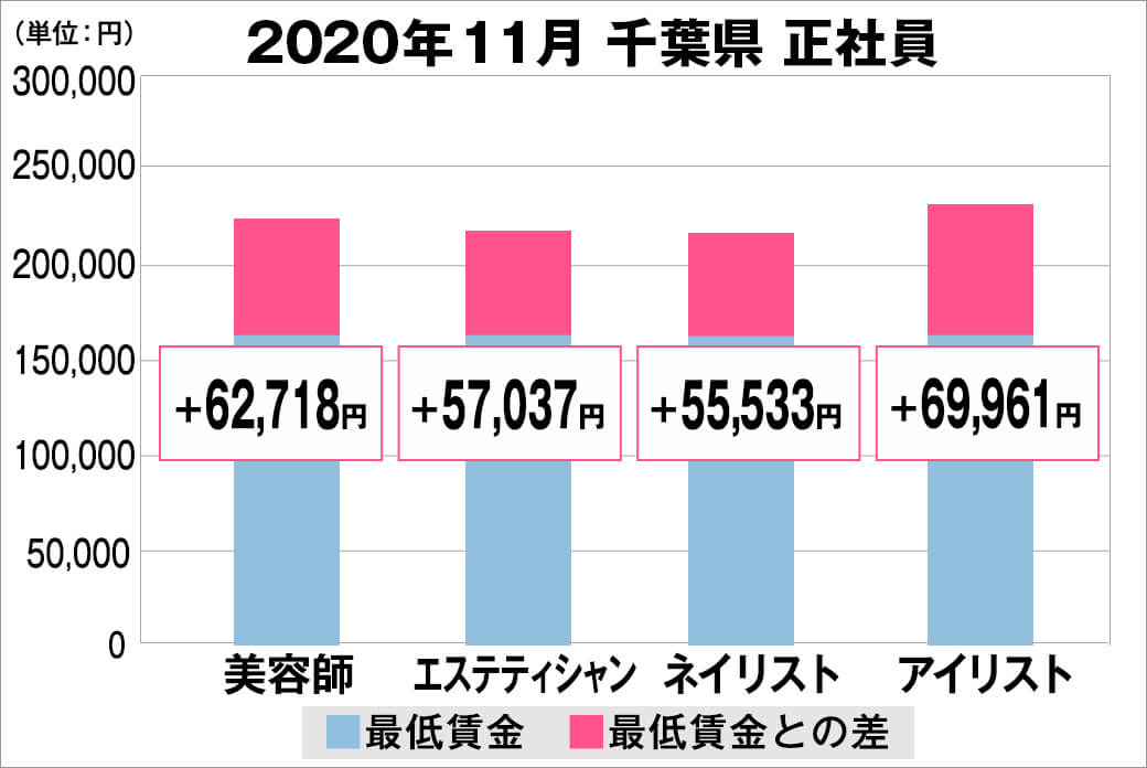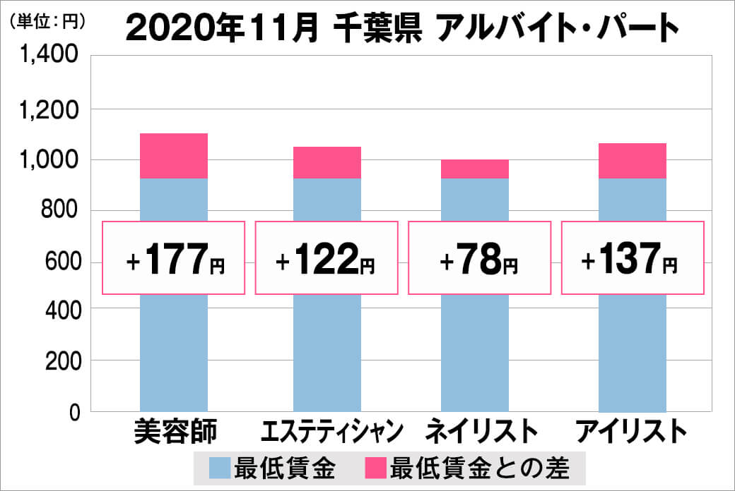 2020年11月時点で『美プロ』に掲載されている「千葉県」の「美容師・エステティシャン・ネイリスト・アイリスト」求人原稿における「正社員」「アルバイト・パート」の給料を抽出。