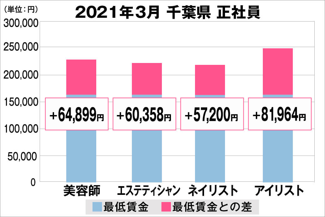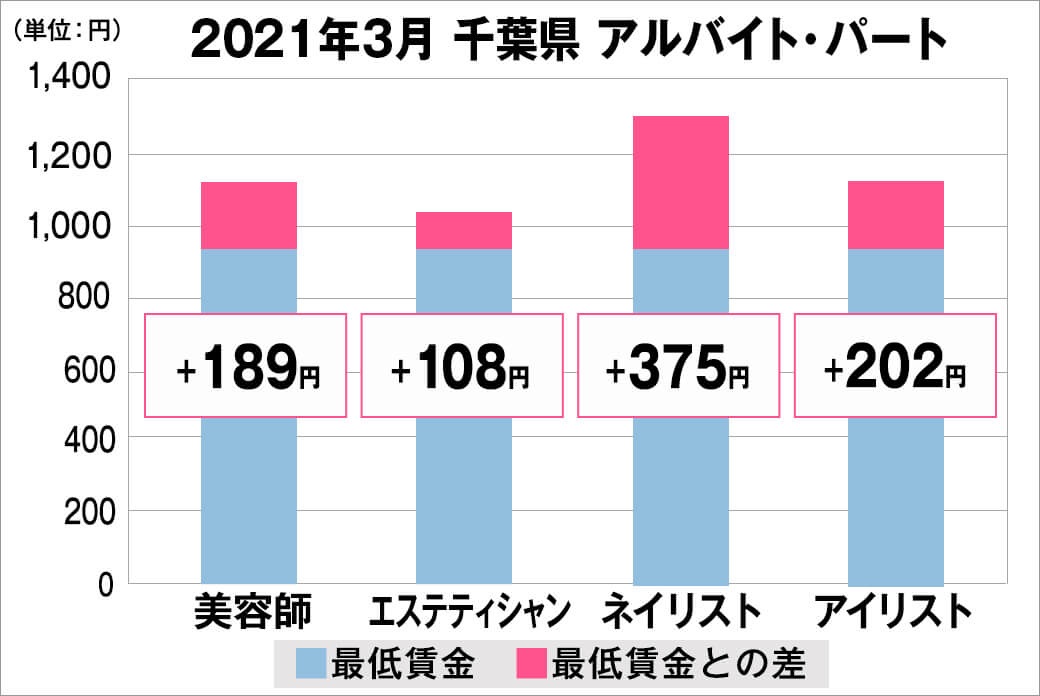 2021年3月時点で『美プロ』に掲載されている「千葉県」の「美容師・エステティシャン・ネイリスト・アイリスト」求人原稿における「正社員」「アルバイト・パート」の給料を抽出。