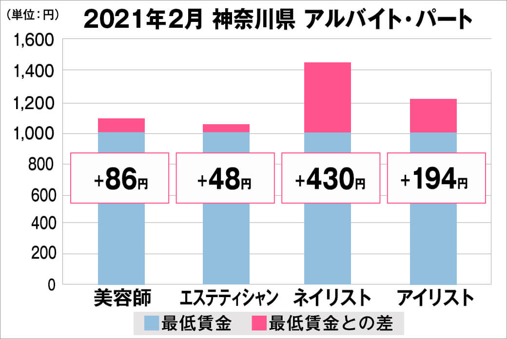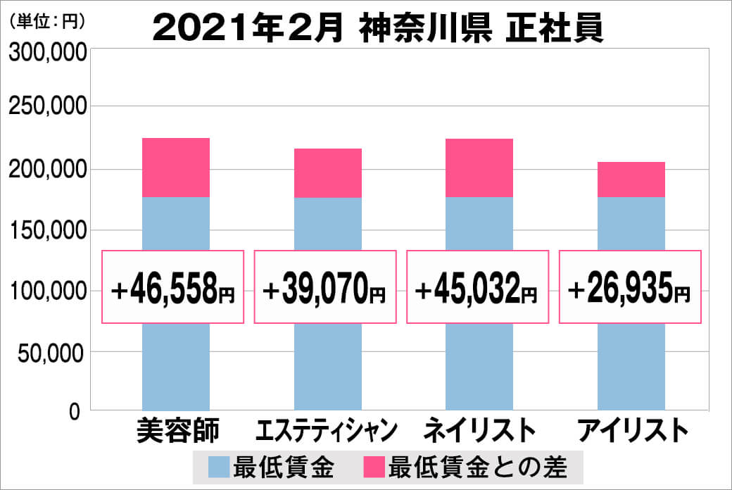 2021年2月時点で『美プロ』に掲載されている「神奈川県」の「美容師・エステティシャン・ネイリスト・アイリスト」求人原稿における「正社員」「アルバイト・パート」の給料を抽出。