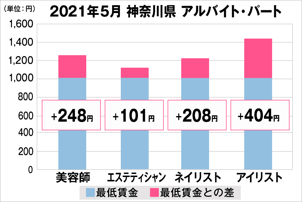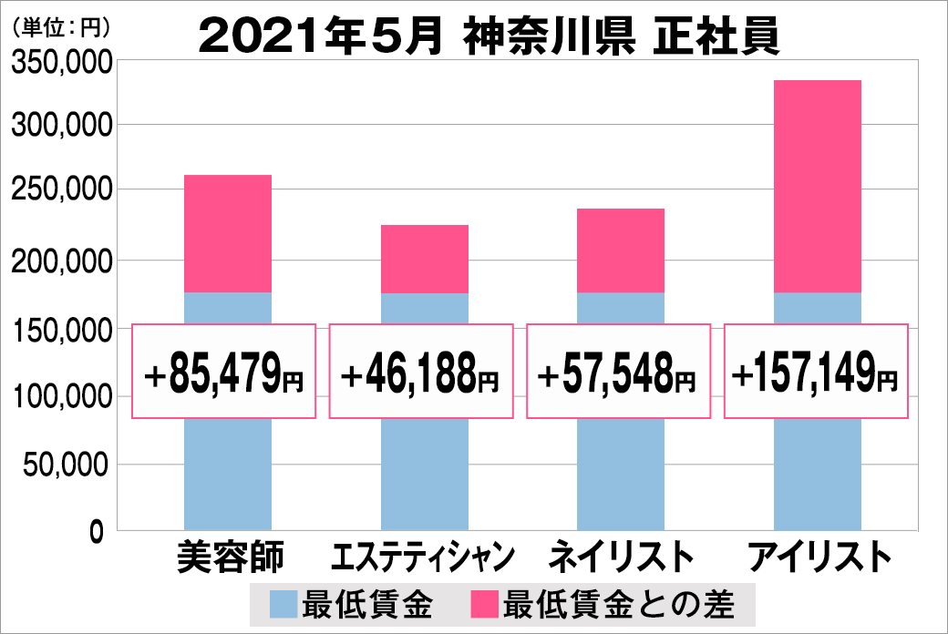 2021年5月時点で『美プロ』に掲載されている「神奈川県」の「美容師・エステティシャン・ネイリスト・アイリスト」求人原稿における「正社員」「アルバイト・パート」の給料を抽出。