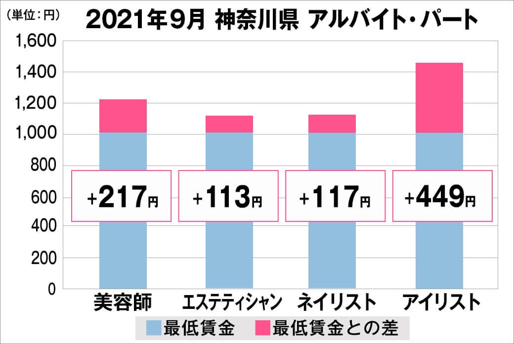 2021年9月時点で『美プロ』に掲載されている「神奈川県」の「美容師・エステティシャン・ネイリスト・アイリスト」求人原稿における「正社員」「アルバイト・パート」の給料を抽出。