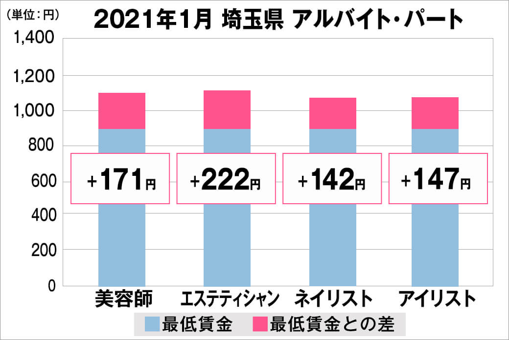 2021年1月時点で『美プロ』に掲載されている「埼玉県」の「美容師・エステティシャン・ネイリスト・アイリスト」求人原稿における「正社員」「アルバイト・パート」の給料を抽出。