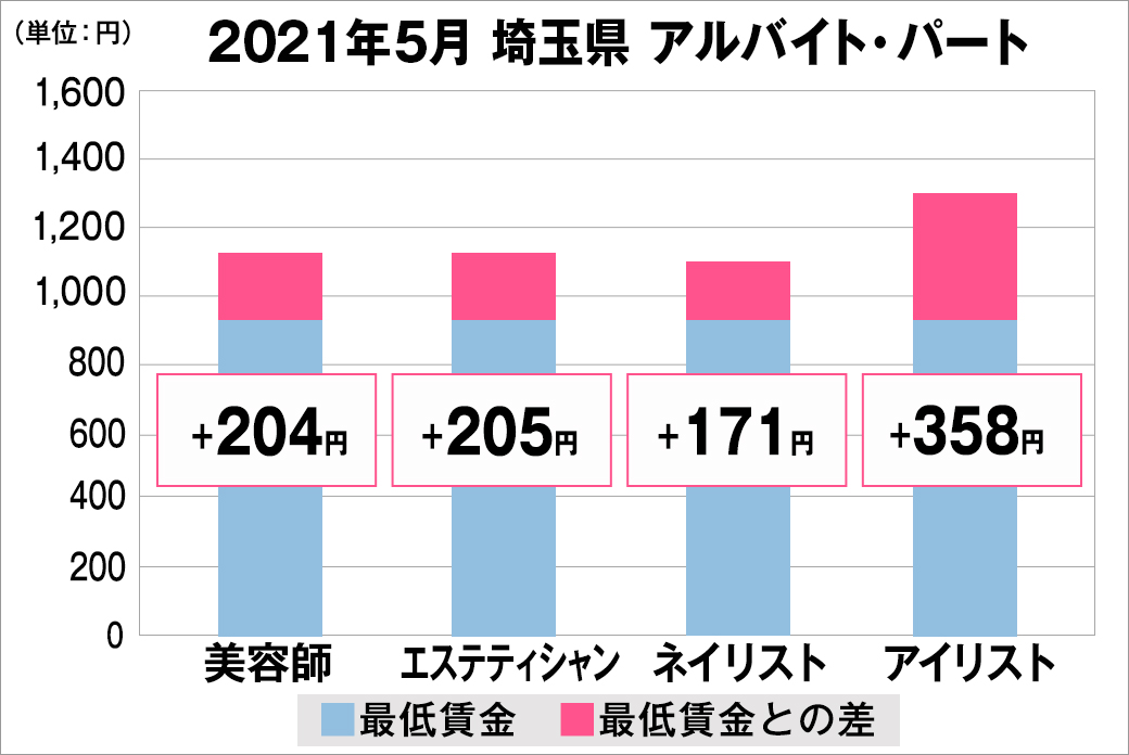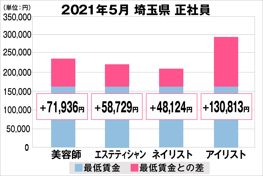 2021年5月時点で『美プロ』に掲載されている「埼玉県」の「美容師・エステティシャン・ネイリスト・アイリスト」求人原稿における「正社員」「アルバイト・パート」の給料を抽出。