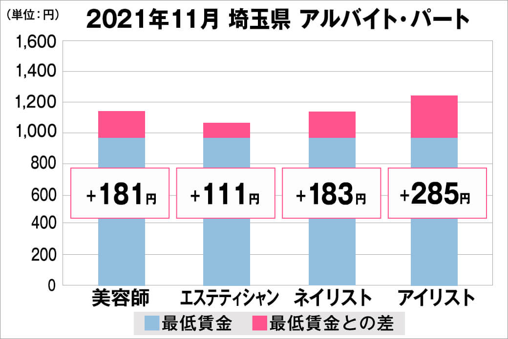 2021年11月時点で『美プロ』に掲載されている「埼玉県」の「美容師・エステティシャン・ネイリスト・アイリスト」求人原稿における「正社員」「アルバイト・パート」の給料を抽出。