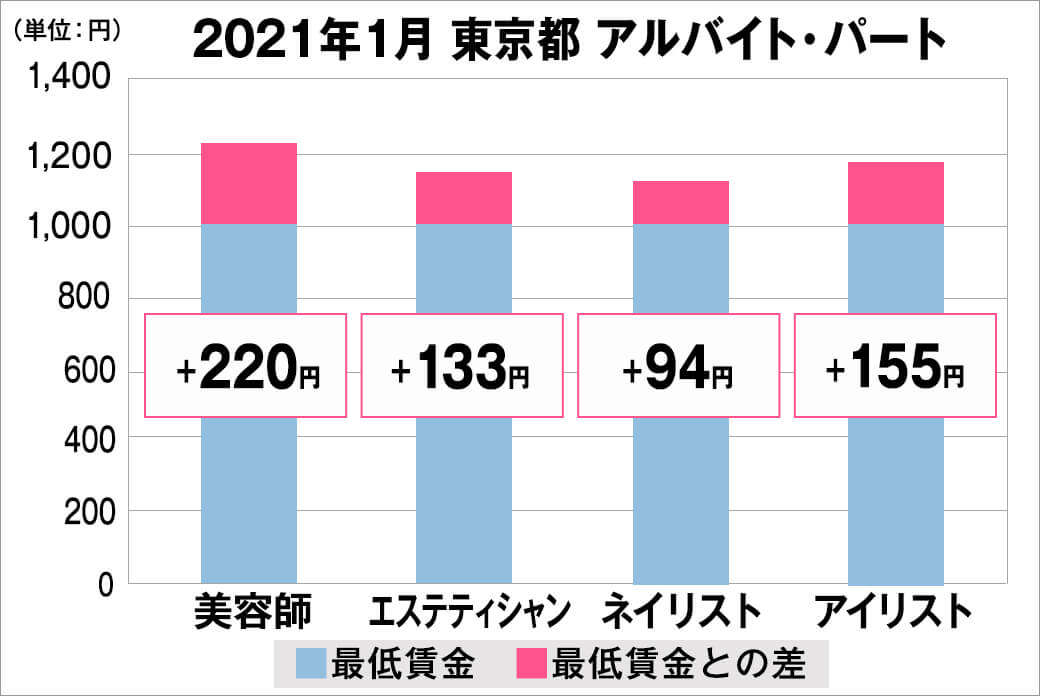 2021年1月時点で『美プロ』に掲載されている「東京都」の「美容師・エステティシャン・ネイリスト・アイリスト」求人原稿における「正社員」「アルバイト・パート」の給料を抽出。