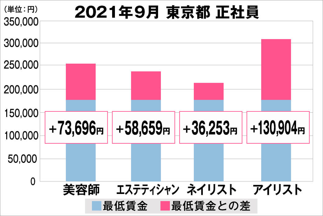 2021年9月時点で『美プロ』に掲載されている「東京都」の「美容師・エステティシャン・ネイリスト・アイリスト」求人原稿における「正社員」「アルバイト・パート」の給料を抽出。