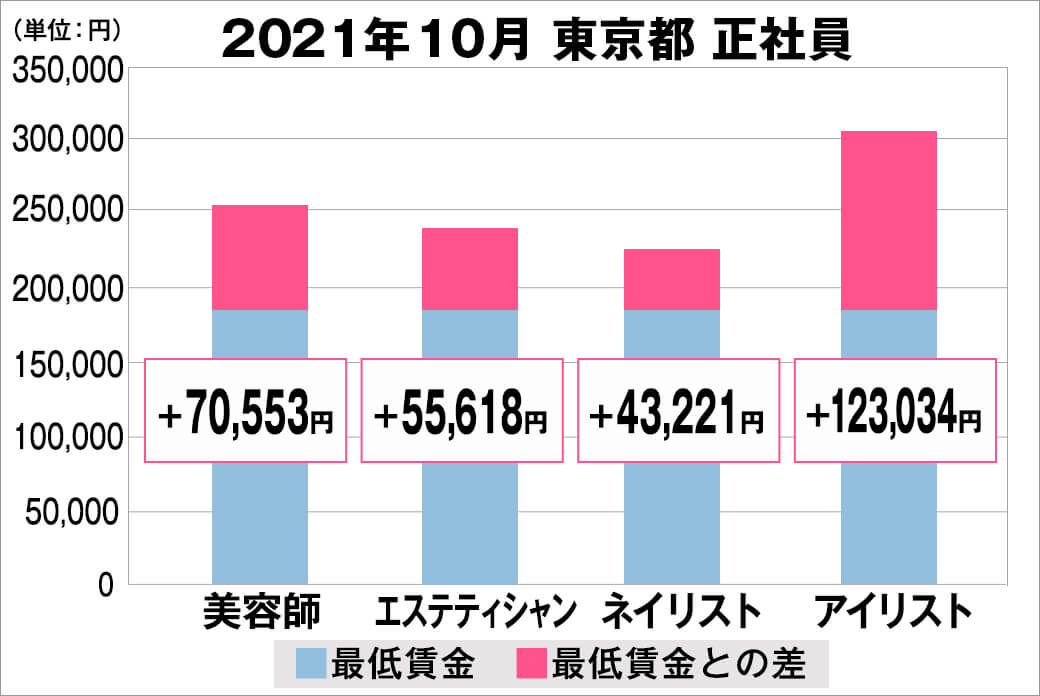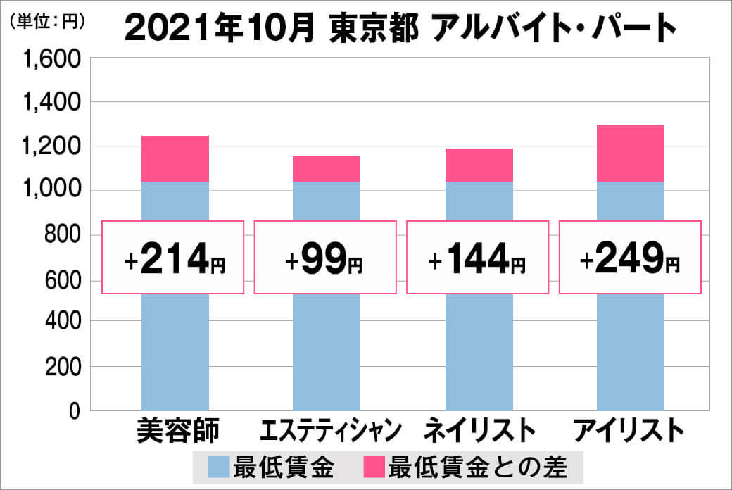 2021年10月時点で『美プロ』に掲載されている「東京都」の「美容師・エステティシャン・ネイリスト・アイリスト」求人原稿における「正社員」「アルバイト・パート」の給料を抽出。