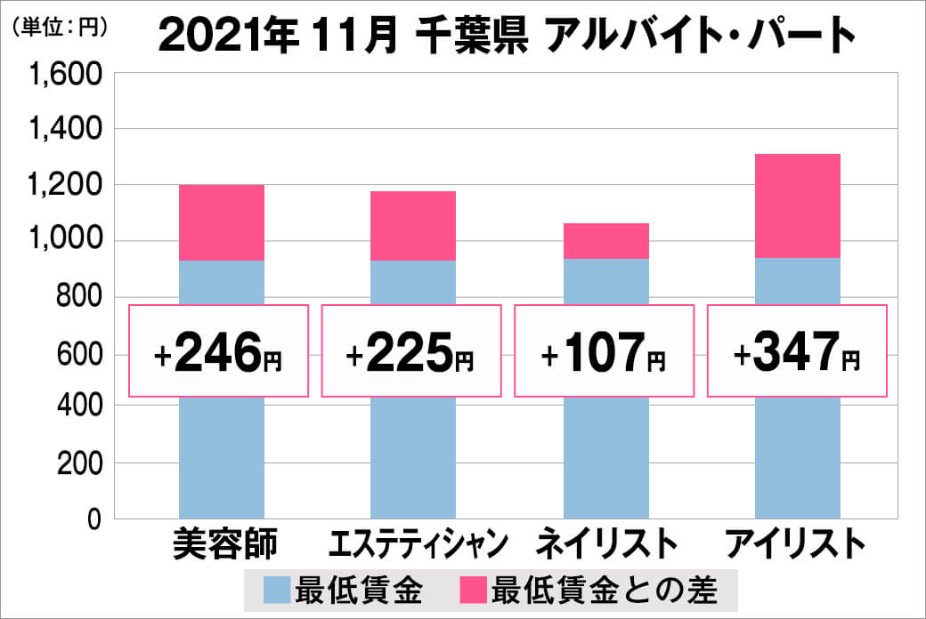 2021年11月時点で『美プロ』に掲載されている「千葉県」の「美容師・エステティシャン・ネイリスト・アイリスト」求人原稿における「正社員」「アルバイト・パート」の給料を抽出。