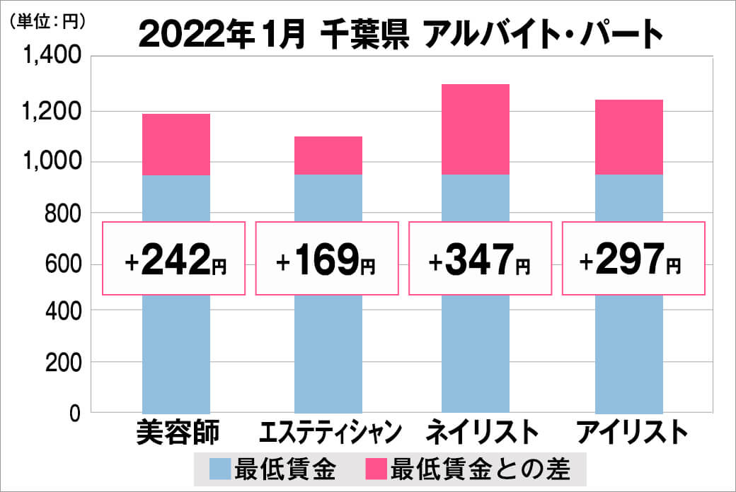 2022年1月時点で『美プロ』に掲載されている「千葉県」の「美容師・エステティシャン・ネイリスト・アイリスト」求人原稿における「正社員」「アルバイト・パート」の給料を抽出。