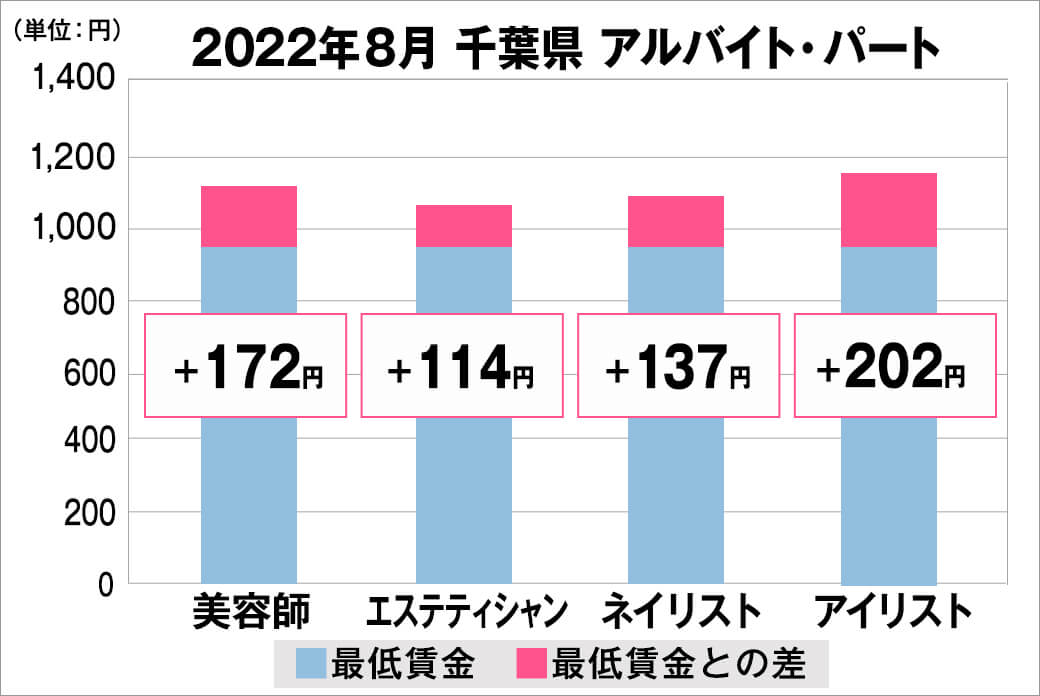 2022年8月時点で『美プロ』に掲載されている「千葉県」の「美容師・エステティシャン・ネイリスト・アイリスト」求人における「正社員」「アルバイト・パート」の給料を抽出。