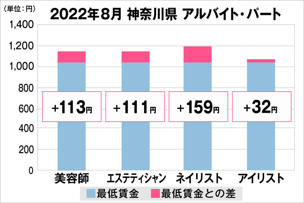 2022年8月時点で『美プロ』に掲載されている「神奈川県」の「美容師・エステティシャン・ネイリスト・アイリスト」求人における「正社員」「アルバイト・パート」の給料を抽出。