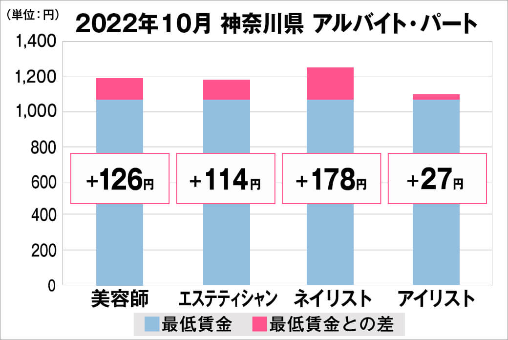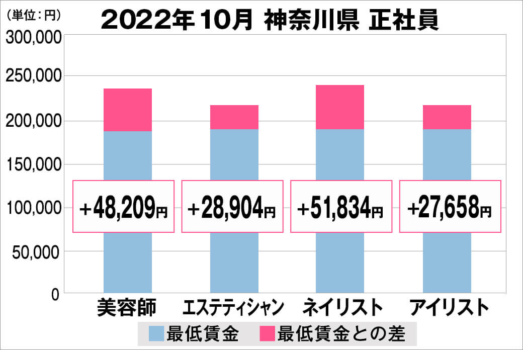 2022年10月時点で『美プロ』に掲載されている「神奈川県」の「美容師・エステティシャン・ネイリスト・アイリスト」求人における「正社員」「アルバイト・パート」の給料を抽出。