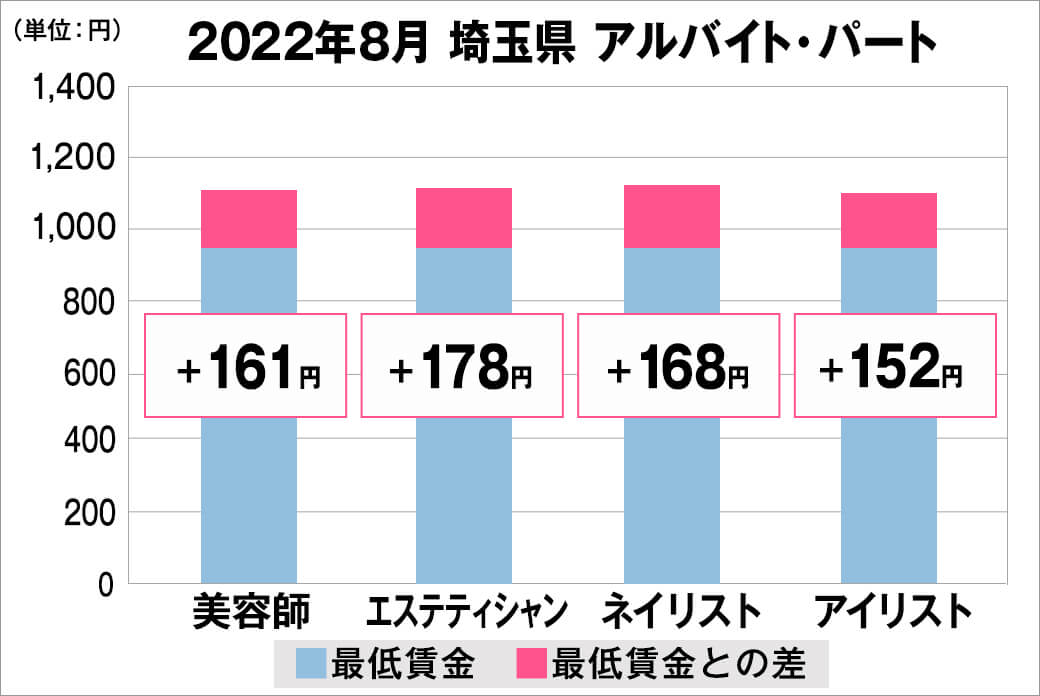 2022年8月時点で『美プロ』に掲載されている「埼玉県」の「美容師・エステティシャン・ネイリスト・アイリスト」求人における「正社員」「アルバイト・パート」の給料を抽出。
