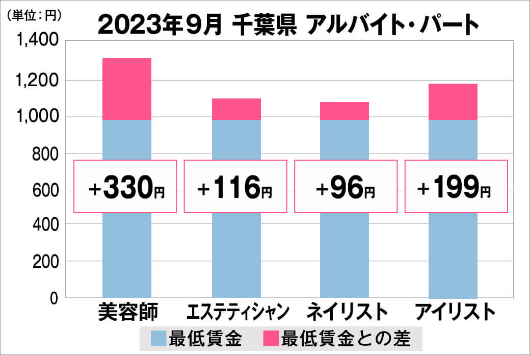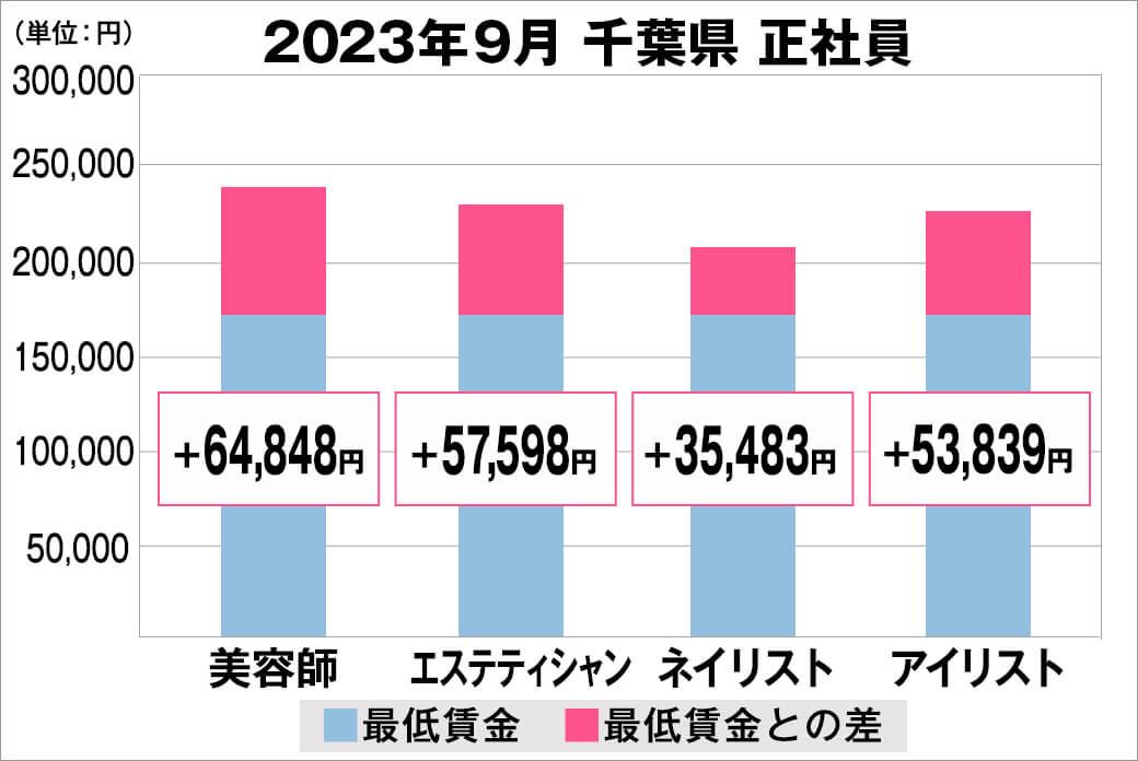 2023年9月時点で『美プロ』に掲載されている「千葉県」の「美容師・エステティシャン・ネイリスト・アイリスト」求人における「正社員」「アルバイト・パート」の給料を抽出。