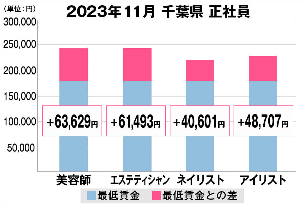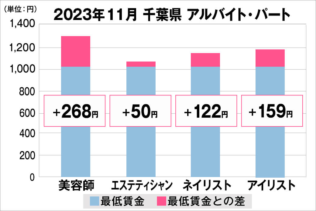 2023年11月時点で『美プロ』に掲載されている「千葉県」の「美容師・エステティシャン・ネイリスト・アイリスト」求人における「正社員」「アルバイト・パート」の給料を抽出。