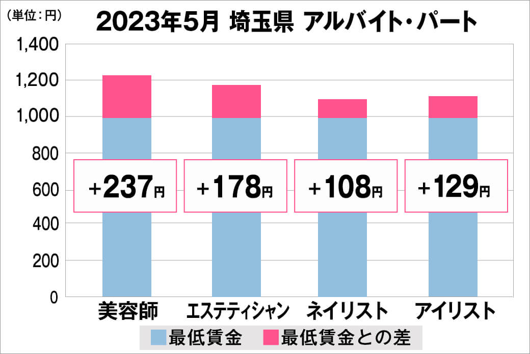 2023年5月時点で『美プロ』に掲載されている「埼玉県」の「美容師・エステティシャン・ネイリスト・アイリスト」求人における「正社員」「アルバイト・パート」の給料を抽出。
