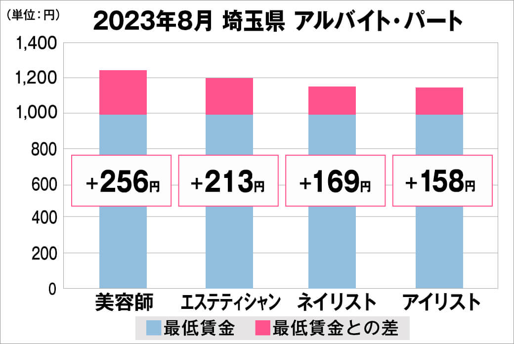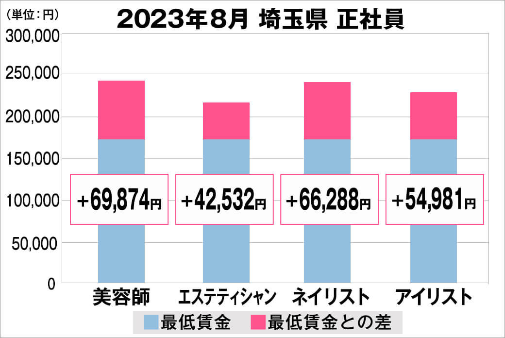 2023年8月時点で『美プロ』に掲載されている「埼玉県」の「美容師・エステティシャン・ネイリスト・アイリスト」求人における「正社員」「アルバイト・パート」の給料を抽出。