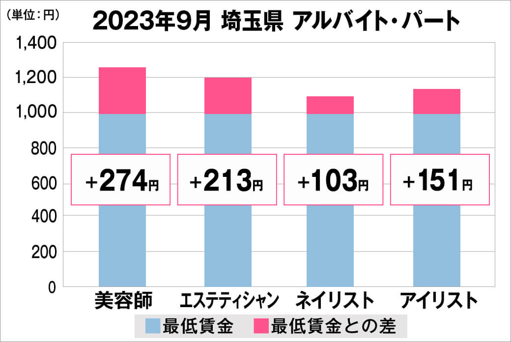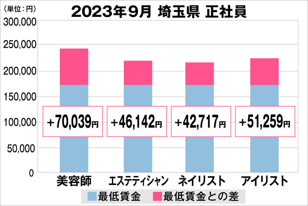 2023年9月時点で『美プロ』に掲載されている「埼玉県」の「美容師・エステティシャン・ネイリスト・アイリスト」求人における「正社員」「アルバイト・パート」の給料を抽出。