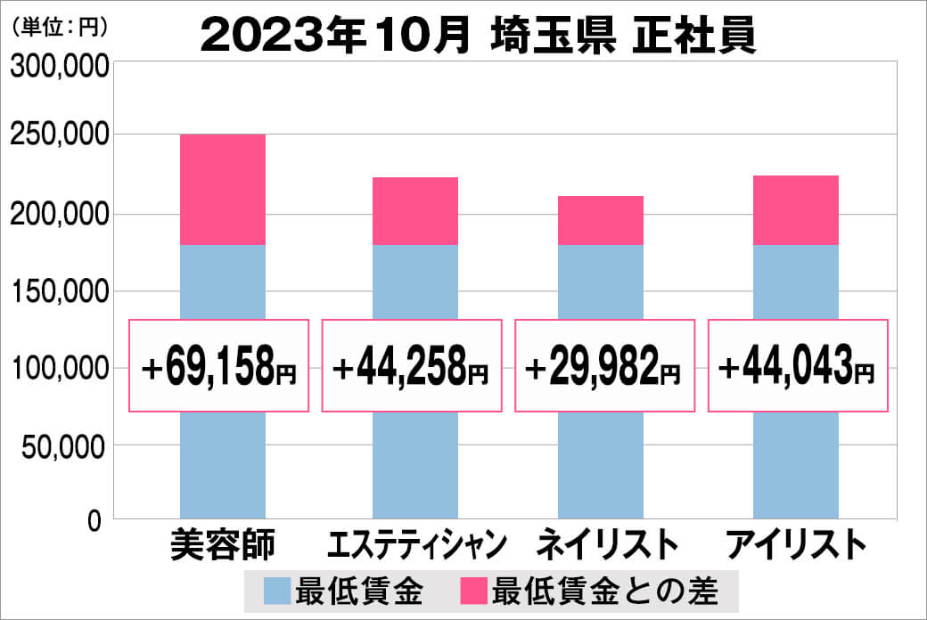 2023年10月時点で『美プロ』に掲載されている「埼玉県」の「美容師・エステティシャン・ネイリスト・アイリスト」求人における「正社員」「アルバイト・パート」の給料を抽出。