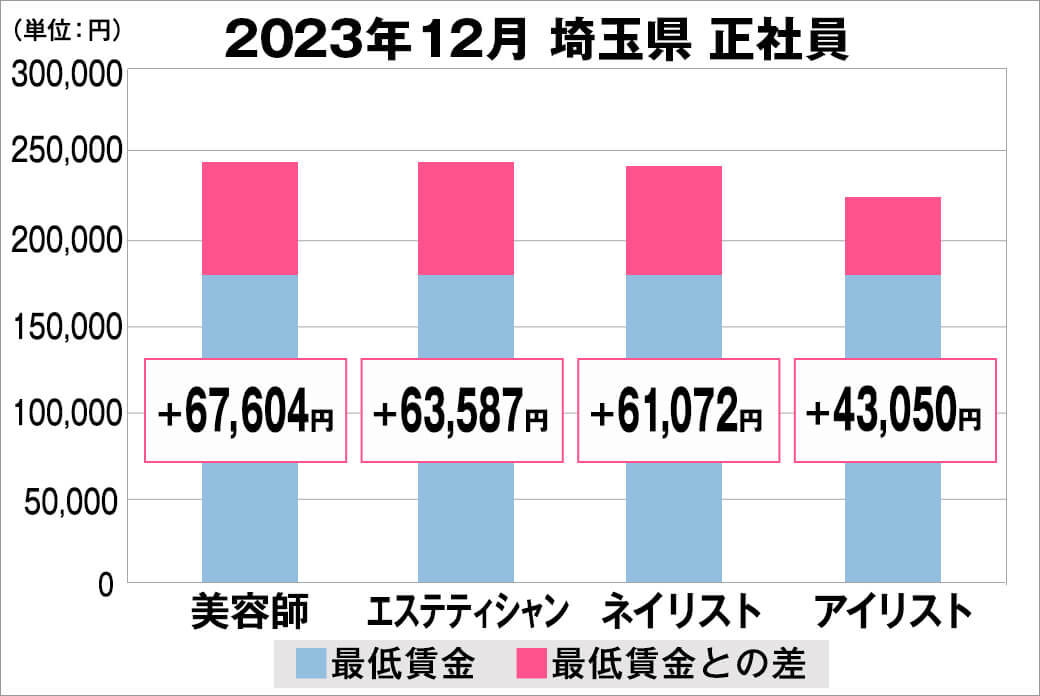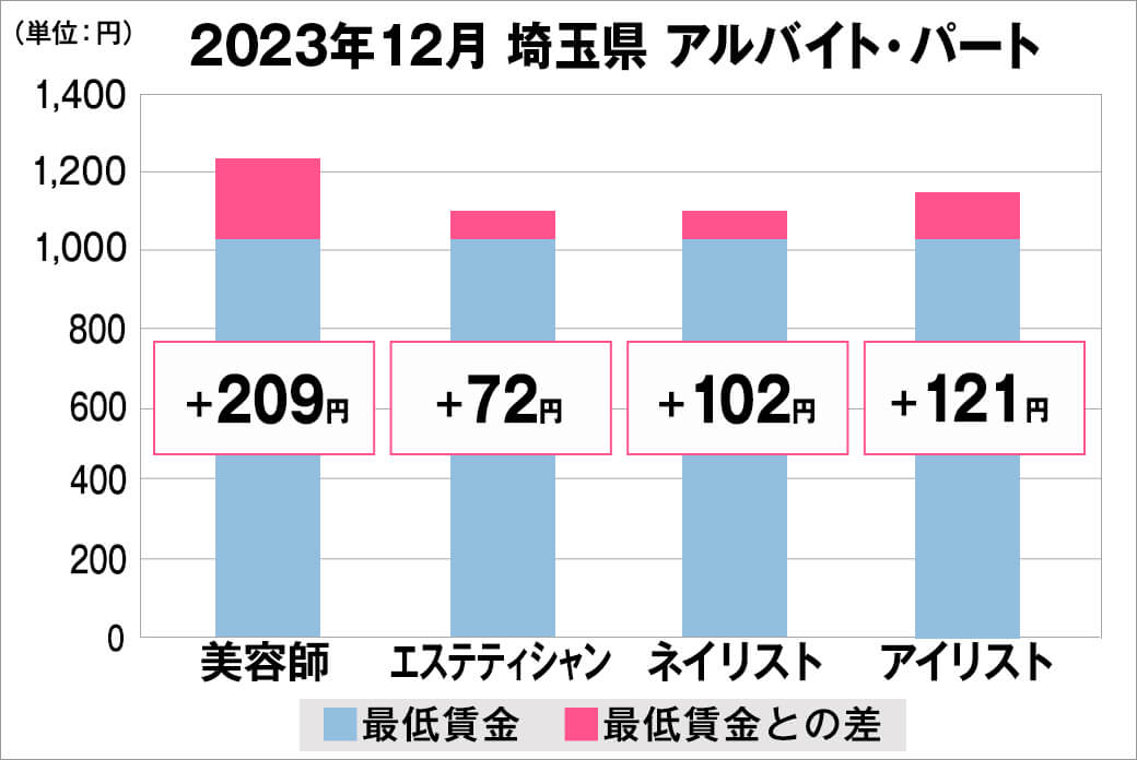 2023年12月時点で『美プロ』に掲載されている「埼玉県」の「美容師・エステティシャン・ネイリスト・アイリスト」求人における「正社員」「アルバイト・パート」の給料を抽出。