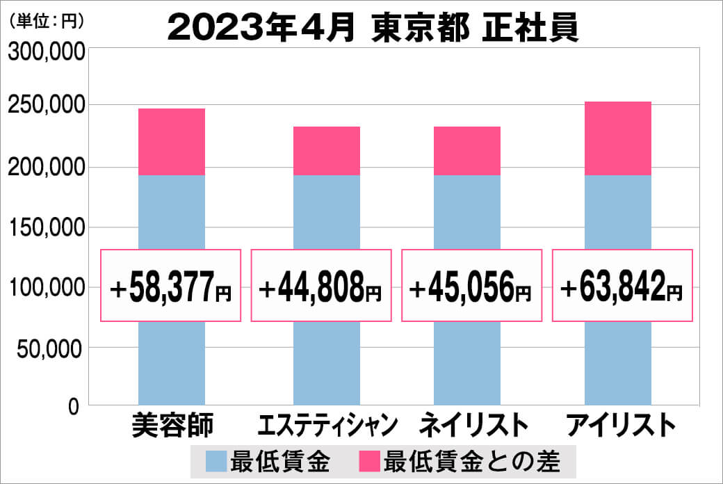 2023年4月時点で『美プロ』に掲載されている「東京都」の「美容師・エステティシャン・ネイリスト・アイリスト」求人における「正社員」「アルバイト・パート」の給料を抽出。