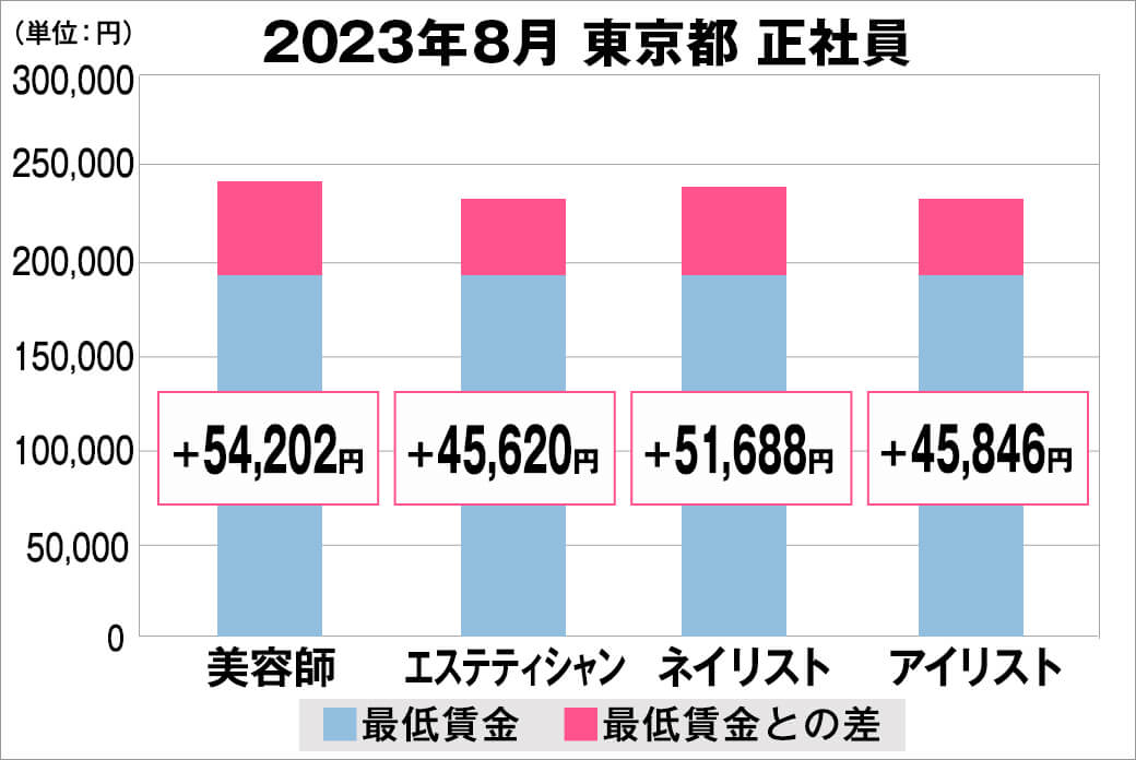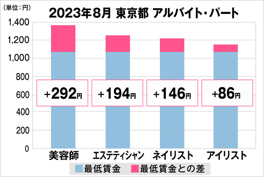 2023年8月時点で『美プロ』に掲載されている「東京都」の「美容師・エステティシャン・ネイリスト・アイリスト」求人における「正社員」「アルバイト・パート」の給料を抽出。