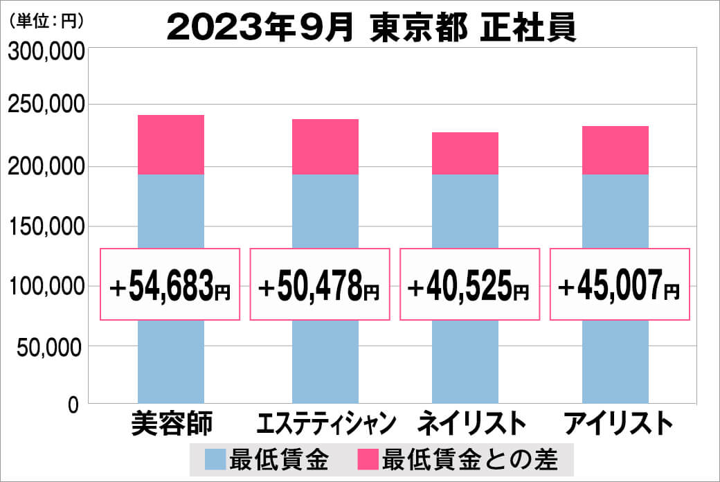 2023年9月時点で『美プロ』に掲載されている「東京都」の「美容師・エステティシャン・ネイリスト・アイリスト」求人における「正社員」「アルバイト・パート」の給料を抽出。